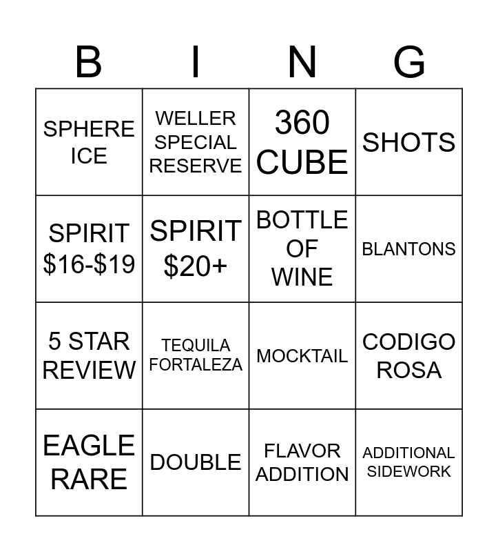This bingo card has 16 words: DOUBLE, CODIGO ROSA, 360 CUBE, SPHERE ICE, 5 STAR REVIEW, WELLER SPECIAL RESERVE, MOCKTAIL, FLAVOR ADDITION, SPIRIT $16-$19, SPIRIT $20+, EAGLE RARE, SHOTS, TEQUILA FORTALEZA, BLANTONS, BOTTLE OF WINE and ADDITIONAL SIDEWORK.