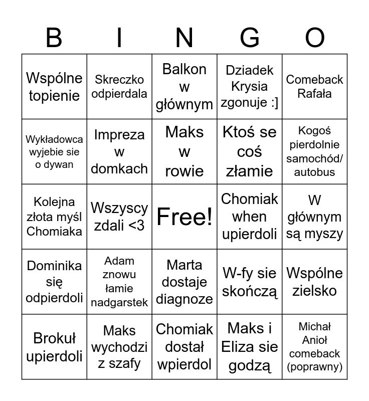 This bingo card has a free space and 24 words: Brokuł upierdoli, Adam znowu łamie nadgarstek, Maks w rowie, Maks i Eliza sie godzą, Comeback Rafała, Wspólne topienie, Skreczko odpierdala, Balkon w głównym, Chomiak when upierdoli, W głównym są myszy, Kolejna złota myśl Chomiaka, Impreza w domkach, W-fy sie skończą, Wspólne zielsko, Wykładowca wyjebie sie o dywan, Maks wychodzi z szafy, Chomiak dostał wpierdol, Dziadek Krysia zgonuje :], Kogoś pierdolnie samochód/ autobus, Dominika się odpierdoli, Wszyscy zdali <3, Marta dostaje diagnoze, Ktoś se coś złamie and Michał Anioł comeback (poprawny).