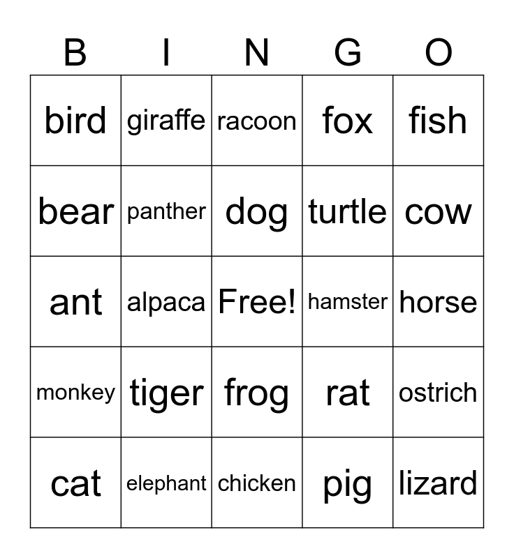 This bingo card has a free space and 24 words: tiger, elephant, dog, cat, fish, bird, bear, giraffe, hamster, frog, turtle, ant, rat, ostrich, panther, pig, horse, racoon, cow, alpaca, lizard, monkey, fox and chicken.