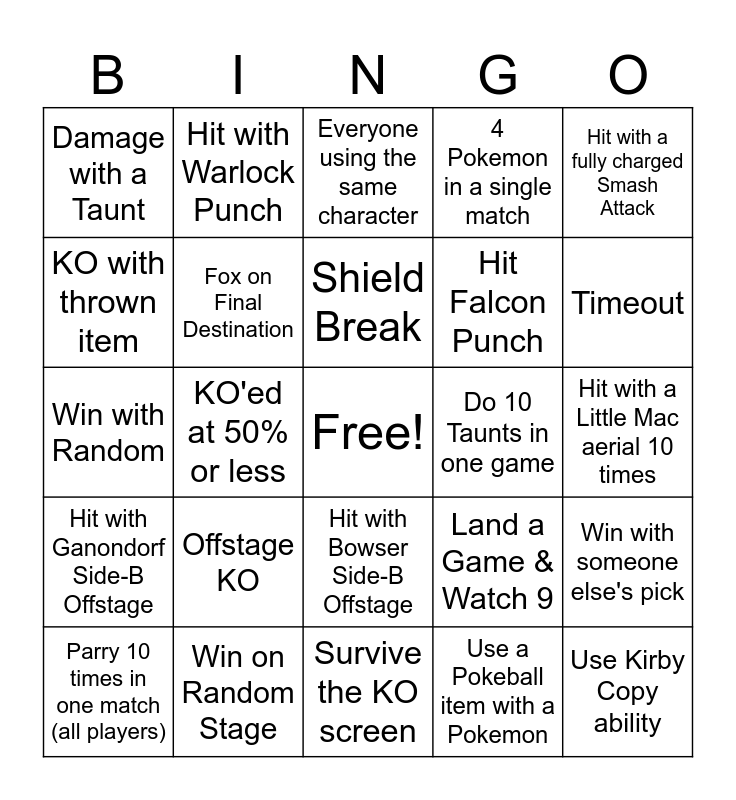 This bingo card has a free space and 29 words: Parry 10 times in one match (all players), Self-Destruct at 0%, KO'ed at 50% or less, Win without using up-b at all, Damage with a Taunt, Everyone using the same character, Fox on Final Destination, Offstage KO, Do 10 Taunts in one game, Win on Random Stage, Hit with a Little Mac aerial 10 times, Use Kirby Copy ability, Survive the KO screen, Use a Pokeball item with a Pokemon, Timeout, Hit someone while offstage, Hit with Bowser Side-B Offstage, Hit with Ganondorf Side-B Offstage, Hit with a fully charged Smash Attack, Win with Random, Land a Game & Watch 9, Survive to 200%, Hit Falcon Punch, KO with thrown item, 4 Pokemon in a single match, Hit with Warlock Punch, Win with someone else's pick, Shield Break and Win without losing a stock.