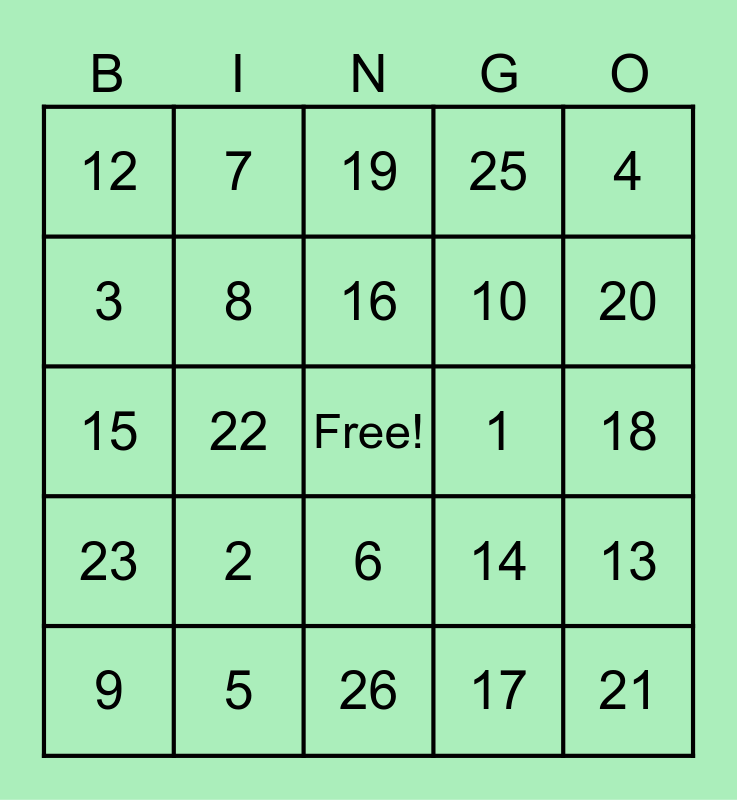 This bingo card has a free space and 24 words: 2, 5, 16, 9, 4, 12, 3, 7, 1, 6, 10, 15, 14, 13, 8, 17, 18, 19, 20, 22, 21, 23, 25 and 26.