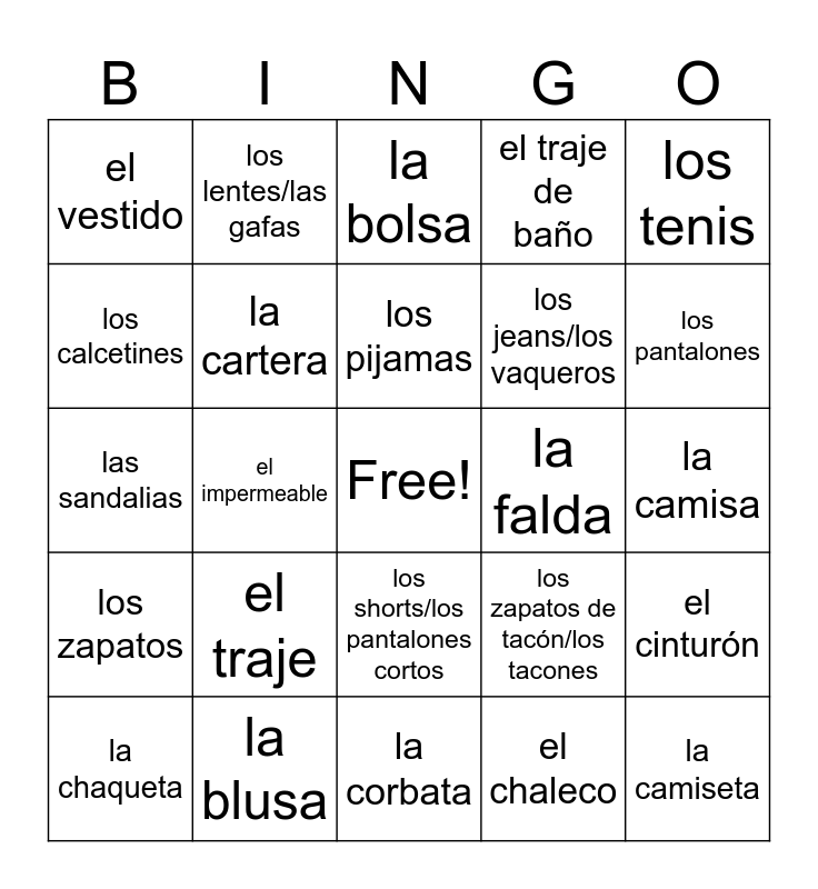 This bingo card has a free space and 29 words: la chaqueta, la sudadera, el impermeable, el suéter, el vestido, la bolsa, la cartera, el traje, la falda, la blusa, la camisa, la camiseta, la corbata, el chaleco, los pantalones, los sudaderos/los pantalones deportivos, los shorts/los pantalones cortos, los zapatos, los tenis, las sandalias, los zapatos de tacón/los tacones, las botas, los jeans/los vaqueros, los calcetines, el traje de baño, los lentes/las gafas, el cinturón, los pijamas and la ropa interior.