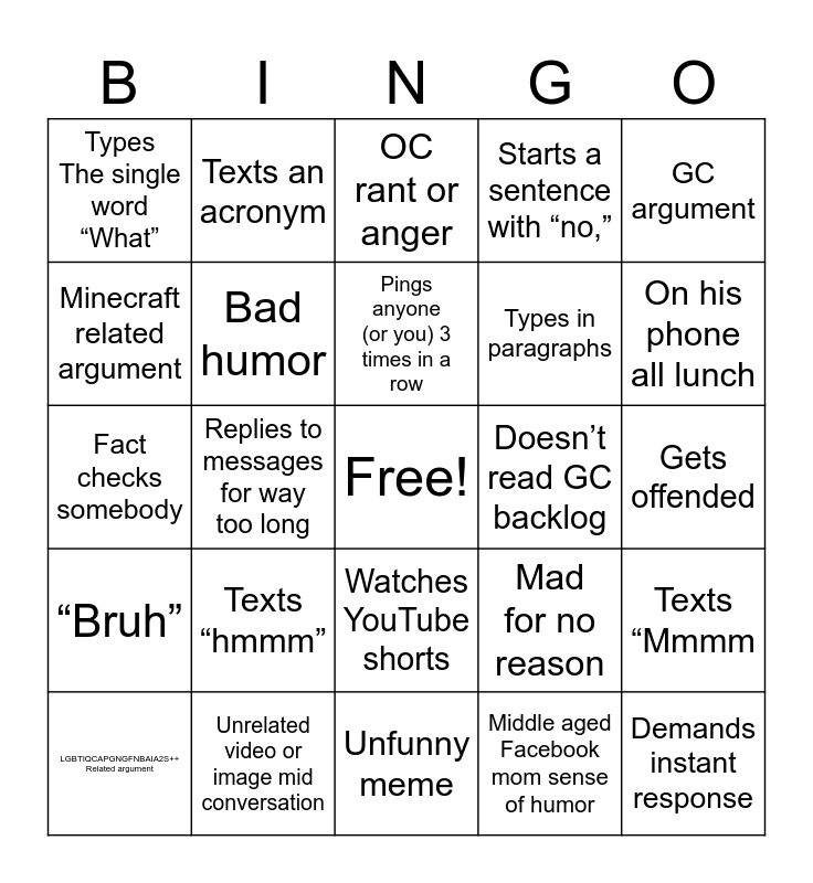 This bingo card has a free space and 29 words: LGBTIQCAPGNGFNBAIA2S++ Related argument, Pings anyone, Replies to messages for way too long, Uses 😭 Emoji, Types The single word “What”, OC rant or anger, Bad humor, Texts “hmmm”, Doesn’t read GC backlog, Unrelated video or image mid conversation, Gets offended, Demands instant response, Unfunny meme, Middle aged Facebook mom sense of humor, On his phone all lunch, Texts the single character “?”, Watches YouTube shorts, “Bruh”, GC argument, Fact checks somebody, Mad for no reason, Gets super defensive, Types in paragraphs, Minecraft related argument, Starts a sentence with “no,”, Texts an acronym, Texts “Mmmm, Pings anyone (or you) 3 times in a row and Gets offended over nothing.
