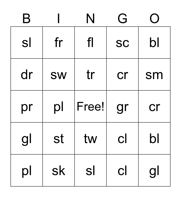 This bingo card has a free space and 28 words: bl, br, cr, cl, dr, fl, fr, gl, gr, pl, pr, sc, sk, sl, sm, sp, st, sw, tr, tw, sl, sc, gl, pl, cr, cl, bl and br.
