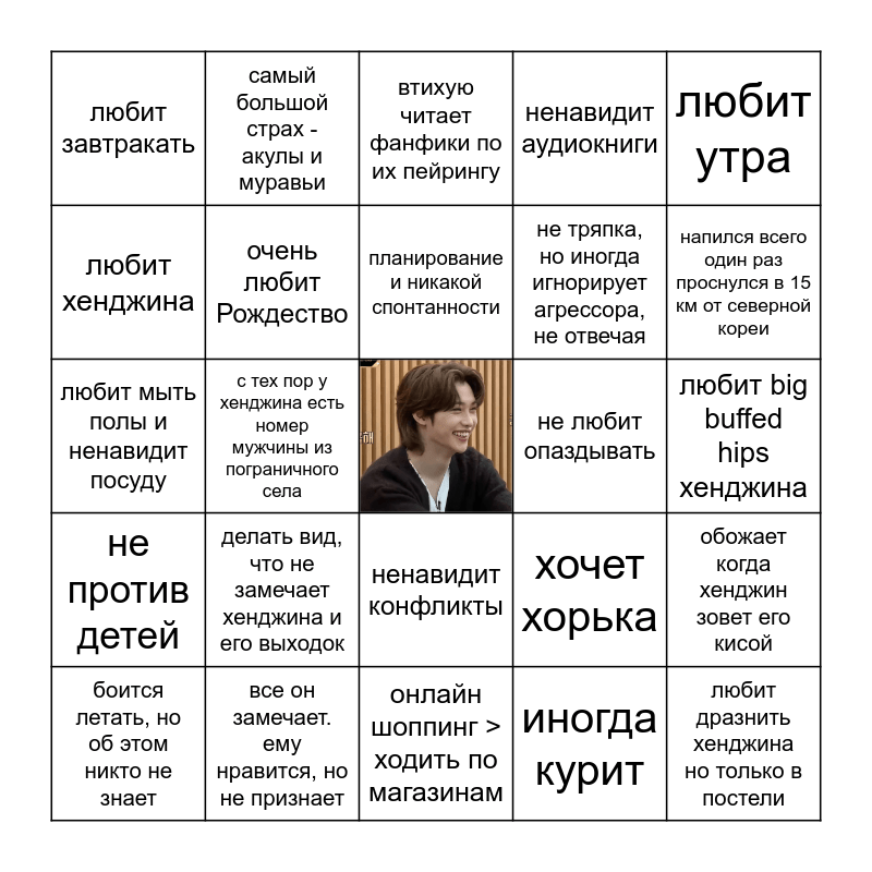 This bingo card has a free space and 24 words: делать вид, что не замечает хенджина и его выходок, все он замечает. ему нравится, но не признает, планирование и никакой спонтанности, боится летать, но об этом никто не знает, любит утра, любит завтракать, любит хенджина, самый большой страх - акулы и муравьи, не любит опаздывать, ненавидит конфликты, не тряпка, но иногда игнорирует агрессора, не отвечая, любит мыть полы и ненавидит посуду, хочет хорька, обожает когда хенджин зовет его кисой, очень любит Рождество, иногда курит, любит big buffed hips хенджина, втихую читает фанфики по их пейрингу, напился всего один раз проснулся в 15 км от северной кореи, с тех пор у хенджина есть номер мужчины из пограничного села, любит дразнить хенджина но только в постели, не против детей, ненавидит аудиокниги and онлайн шоппинг > ходить по магазинам.