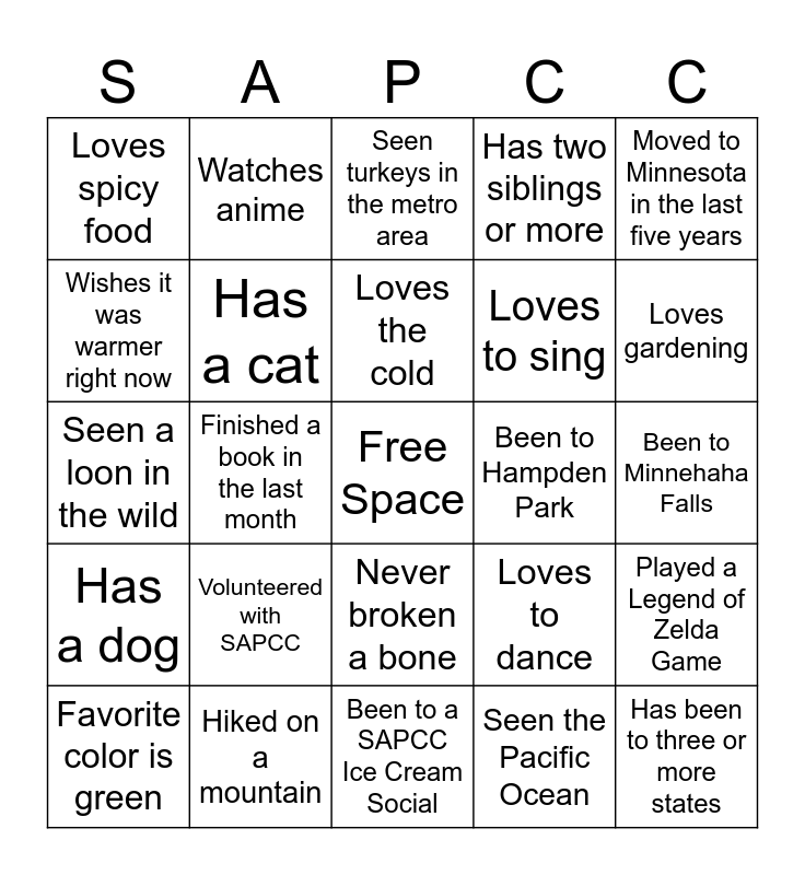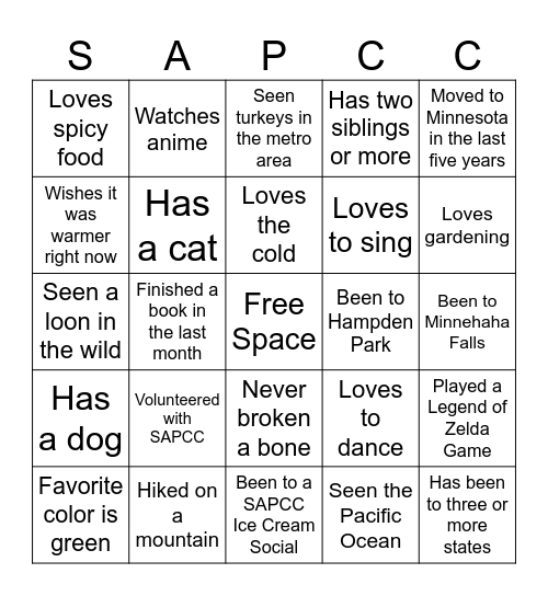 This bingo card has a free space and 39 words: Plays an instrument, Speaks multiple languages, Lived in SEAL more than 10 years, Has a cat, Favorite color is green, Never broken a bone, Loves the cold, Has met someone famous, Moved to Minnesota in the last five years, Has a dog, Finished a book in the last month, Has two siblings or more, Has been to three or more states, Been to Minnehaha Falls, Been to Hampden Park, Volunteered with SAPCC, Been to Keys Cafe, Loves spicy food, Football Fan, Loves to dance, Wishes it was warmer right now, Been to a SAPCC Ice Cream Social, Loves to sing, Loves gardening, Been to the reptile store, Seen a bear in the wild, Made pumpkin pie, Doesn't like sparkling water, Recently finished a TV series, Watches anime, Owns a record player, Baseball Fan, Seen turkeys in the metro area, Hiked on a mountain, Seen the Pacific Ocean, Seen Lake Superior, Played a Legend of Zelda Game, Seen a loon in the wild and Been to a local concert in the last year.