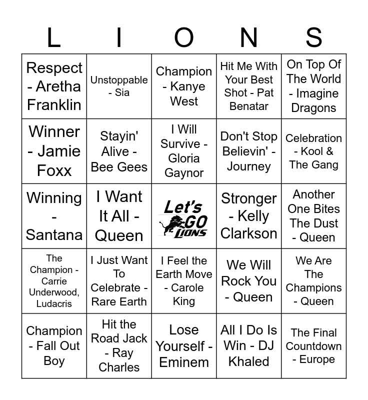 This bingo card has a free space and 28 words: We Are The Champions - Queen, Eye of the Tiger - Survivor, Don't Stop Believin' - Journey, All I Do Is Win - DJ Khaled, Winner - Jamie Foxx, Champion - Kanye West, Unstoppable - Sia, The Champion - Carrie Underwood, Ludacris, Stronger - Kelly Clarkson, Champion - Fall Out Boy, Winning - Santana, Hit Me With Your Best Shot - Pat Benatar, Hit the Road Jack - Ray Charles, Lose Yourself - Eminem, Celebration - Kool & The Gang, I Gotta Feeling - Black Eyed Peas, I Just Want To Celebrate - Rare Earth, Stayin' Alive - Bee Gees, I Will Survive - Gloria Gaynor, I Feel the Earth Move - Carole King, Respect - Aretha Franklin, Ain't No Mountain High Enough - Diana Ross, The Final Countdown - Europe, I Want It All - Queen, Another One Bites The Dust - Queen, We Will Rock You - Queen, On Top Of The World - Imagine Dragons and Roar - Katy Perry.