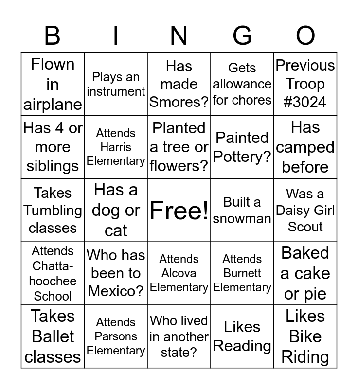 This bingo card has a free space and 24 words: Who has been to Mexico?, Attends Parsons Elementary, Planted a tree or flowers?, Takes Ballet classes, Previous Troop #3024, Flown in airplane, Has 4 or more siblings, Plays an instrument, Built a snowman, Attends Alcova Elementary, Painted Pottery?, Takes Tumbling classes, Attends Burnett Elementary, Baked a cake or pie, Attends Harris Elementary, Likes Reading, Was a Daisy Girl Scout, Has made Smores?, Has camped before, Has a dog or cat, Likes Bike Riding, Attends Chatta- hoochee School, Gets allowance for chores and Who lived in another state?.