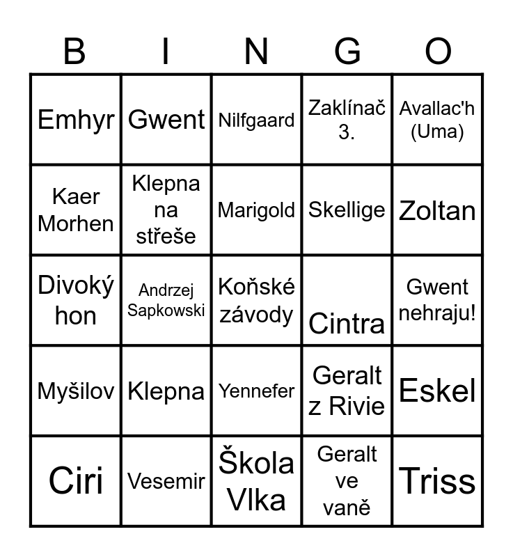 This bingo card has 25 words: Klepna, Škola Vlka, Marigold, Ciri, Avallac'h (Uma), Emhyr, Kaer Morhen, Gwent, Cintra, Yennefer, Skellige, Divoký hon, Geralt z Rivie, Eskel, Klepna na střeše, Triss, Gwent nehraju!, Nilfgaard, Zoltan, Andrzej Sapkowski, Koňské závody, Vesemir, Myšilov, Zaklínač 3. and Geralt ve vaně.
