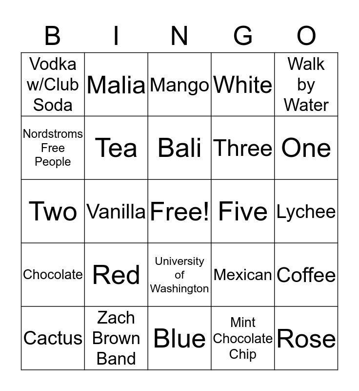 This bingo card has a free space and 24 words: Red, Zach Brown Band, Bali, Cactus, Walk by Water, Vodka w/Club Soda, Nordstroms Free People, Malia, Five, University of Washington, Three, Two, Mexican, Coffee, Tea, Mint Chocolate Chip, Lychee, Mango, One, Vanilla, Rose, Chocolate, White and Blue.