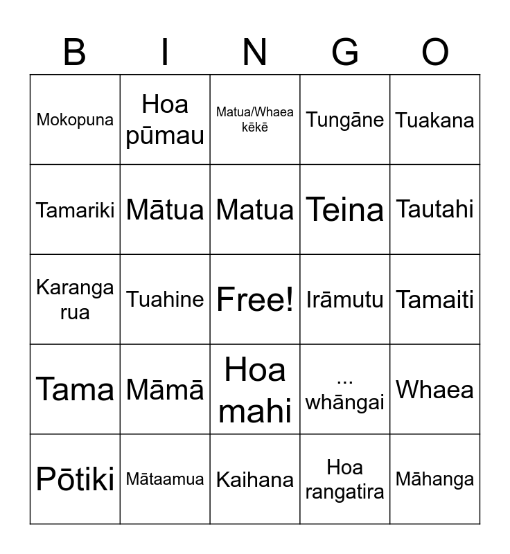 This bingo card has a free space and 38 words: Kuia, Koro/ua, Tūpuna/Tīpuna, Mātua, Whaea, Māmā, Matua, Pāpā, Tuakana, Teina, Tuahine, Tungāne, Māhanga, Tamaiti, Tamariki, Tama, Tamāhine, Matua/Whaea kēkē, Hungarei, Irāmutu, Mokopuna, Mātaamua, Tautahi, Pōtiki, Pēpi, Kaihana, Whanaunga, Tau pūmau, Wahine, Tāne, Hoa, Hoa mahi, Hoa rangatira, Hoa pūmau, ... whakaangi, ... whāngai, Karanga rua and Karanga maha.