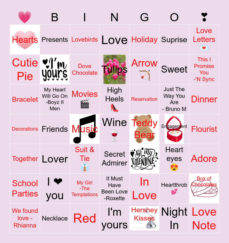 This bingo card has 15 images and 116 words: Be Mine, I ❤ you, Red, Hugs, Kisses 😘, Flowers, Love Letters 💌, Homemade Presents, Chocolate, Glitter, White, Pink, Cards, Romantic Movies, Date Night, Lover, Music, Roses, February, Restaurant, Flourist, Hearts, Necklace, Romantic Comedies, Free!, Teddy Bear, Engagement, Box of Chocolates, Candy, Diamonds, Movies🎬, Love, Arrow🏹, Cupid, Love Note, Gifts, Ribbon, Candles, Secret Admirer, Perfume, Love at first site, Love song, Decorations, Bouquets, Puppy Love, Cologne, Reservation, Heart eyes 😍, Conversation Hearts, Bracelet, Dress, Suit & Tie 👔, Wine🍷, Homecooked Meal, Fourteenth, Balloons🎈, True Love, Lipstick💄, High Heels👠, Hershey Kisses, Affection, Galentine, Poems, Dipped Strawberries 🍓, Dove Chocolate, Sappy Notes, In Love, Sweet, Dinner, School Parties, Presents, Kind, V-day, Crush, Night In, Adore, Cutie Pie, Lovebirds, forget-me-nots, Sentimental, Heartthrob💕, St. Valentine, School Party, Doves🕊, Flirt, Friendship, Holiday, Nail Polish💅, Forgot, Together, Friends, Dessert, Tulips, Last Minute, Suprise, Smitten, Roses are Red, Violets are Blue, Love struck, I'm yours, First Love, Crazy in Love, We found love -Rhianna, All of Me -John Legend, My Girl -The Temptations, It Must Have Been Love -Roxette, Everything - Michael Bublé, Because You Loved Me -Celine D., This I Promise You -'N Sync, Faithfully -Journey, My Heart Will Go On -Boyz II Men, I Will Always Love You Whitney H., Can't Help Falling In Love - Elvis P., If I Ain't Got You -Alicia Keys, Just The Way You Are - Bruno M and How Deep is Your Love -Bee Gees.