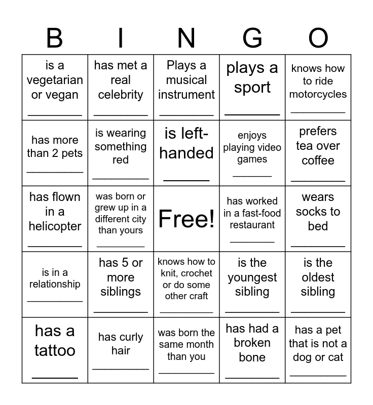 This bingo card has a free space and 24 words: has a tattoo _____, has 5 or more siblings ________, is left-handed _____, has had a broken bone ________, knows how to ride motorcycles _________, is a vegetarian or vegan ________, has met a real celebrity ________, Plays a musical instrument ________, has worked in a fast-food restaurant ________, wears socks to bed ________, has flown in a helicopter ________, is wearing something red _________, is the youngest sibling ________, is the oldest sibling ________, has more than 2 pets _________, has curly hair _________, was born the same month than you __________, plays a sport ______, prefers tea over coffee ________, is in a relationship __________, was born or grew up in a different city than yours _________, knows how to knit, crochet or do some other craft __________, enjoys playing video games _______ and has a pet that is not a dog or cat _________.