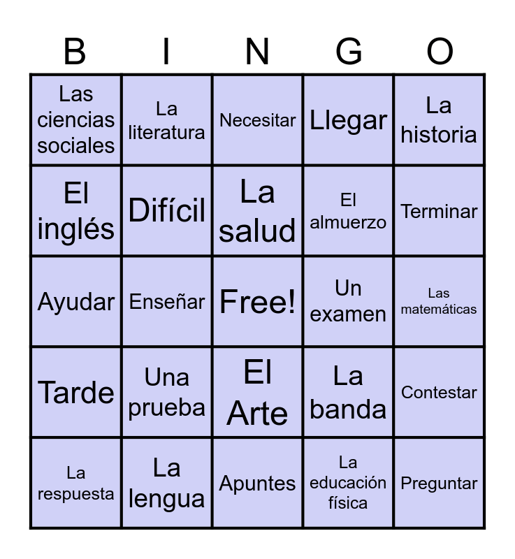 This bingo card has a free space and 26 words: El Arte, La educación física, La salud, La lengua, La historia, Las ciencias sociales, El inglés, La literatura, Las matemáticas, La banda, El almuerzo, Ayudar, Contestar, La respuesta, Enseñar, Esperar, Llegar, Tarde, Necesitar, Preguntar, Terminar, Apuntes, Un examen, Una prueba, Difícil and Fácil.
