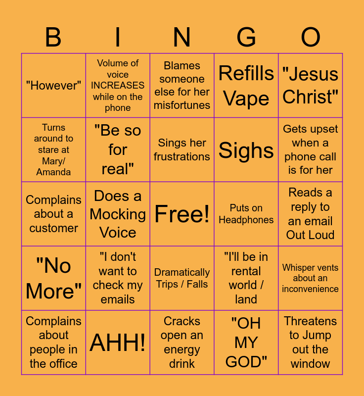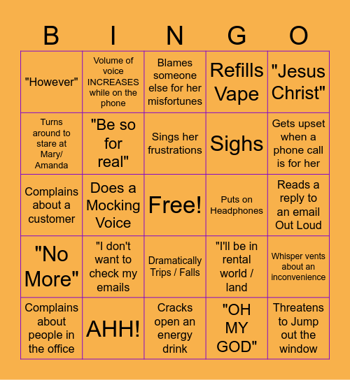 This bingo card has a free space and 24 words: "I don't want to check my emails, AHH!, Sings her frustrations, Complains about people in the office, "Jesus Christ", "However", Turns around to stare at Mary/ Amanda, Volume of voice INCREASES while on the phone, Puts on Headphones, Dramatically Trips / Falls, Sighs, Complains about a customer, "I'll be in rental world / land, Whisper vents about an inconvenience, "Be so for real", "OH MY GOD", Reads a reply to an email Out Loud, Blames someone else for her misfortunes, Gets upset when a phone call is for her, Does a Mocking Voice, Threatens to Jump out the window, "No More", Refills Vape and Cracks open an energy drink.
