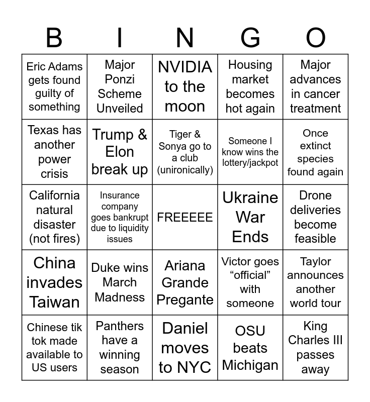 This bingo card has a free space and 24 words: Duke wins March Madness, Panthers have a winning season, Tiger & Sonya go to a club (unironically), Chinese tik tok made available to US users, Major advances in cancer treatment, Eric Adams gets found guilty of something, Texas has another power crisis, Major Ponzi Scheme Unveiled, Ukraine War Ends, Ariana Grande Pregante, Someone I know wins the lottery/jackpot, California natural disaster (not fires), Victor goes “official” with someone, Taylor announces another world tour, Trump & Elon break up, OSU beats Michigan, Drone deliveries become feasible, NVIDIA to the moon, Once extinct species found again, Insurance company goes bankrupt due to liquidity issues, King Charles III passes away, China invades Taiwan, Housing market becomes hot again and Daniel moves to NYC.
