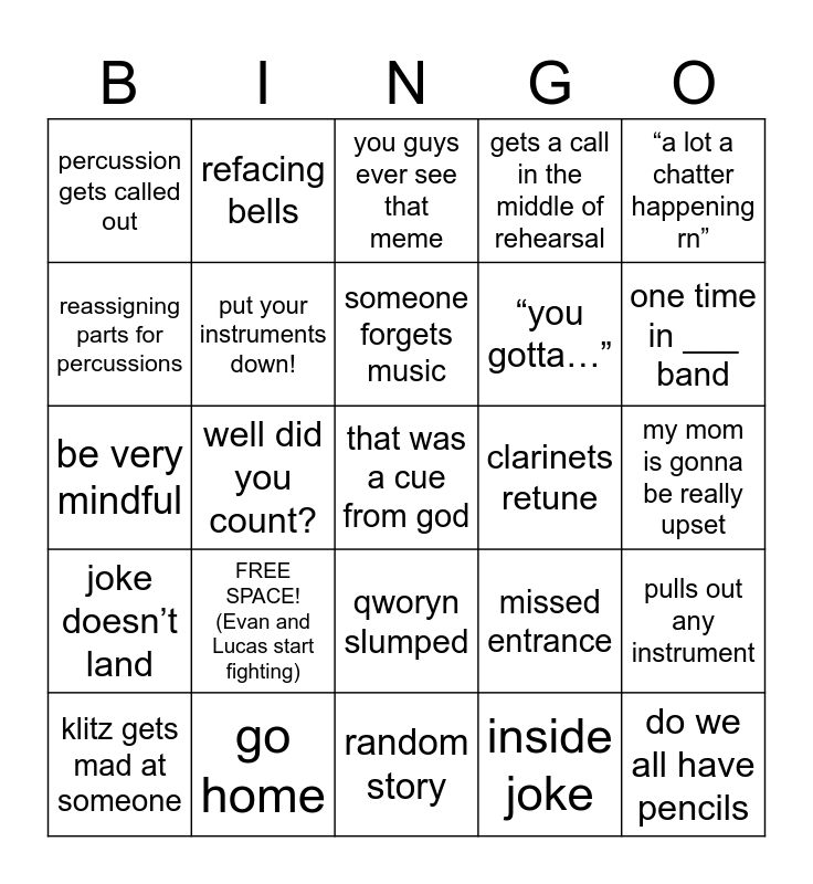 This bingo card has 25 words: FREE SPACE! (Evan and Lucas start fighting), random story, someone forgets music, klitz gets mad at someone, “a lot a chatter happening rn”, percussion gets called out, reassigning parts for percussions, refacing bells, clarinets retune, qworyn slumped, “you gotta…”, be very mindful, missed entrance, pulls out any instrument, put your instruments down!, do we all have pencils, my mom is gonna be really upset, you guys ever see that meme, one time in ___ band, well did you count?, that was a cue from god, go home, joke doesn’t land, gets a call in the middle of rehearsal and inside joke.
