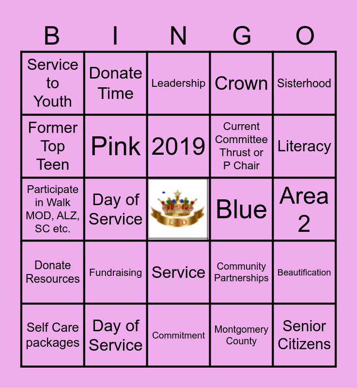 This bingo card has a free space and 34 words: Officer in Chapter, Attended Parliament Top or Syn Lod, Orchid ,pin or Corsage, Top Teen, Area 2, Former Top Teen, Pink, Commitment, Current Committee Thrust or P Chair, Senior Citizens, Participate in Walk MOD, ALZ, SC etc., Donate Time, Montgomery County, Status of Women, Donate Resources, Day of Service, Service, Blue, Beautification, Self Care packages, Day of Service, MLK Jr., Crown, Literacy, Vision Boards, Fundraising, Leadership, Positive Communication, Sisterhood, Service to Youth, January 26th, 2019, Community Partnerships and NCNW NAACP SCDAA UNCF.