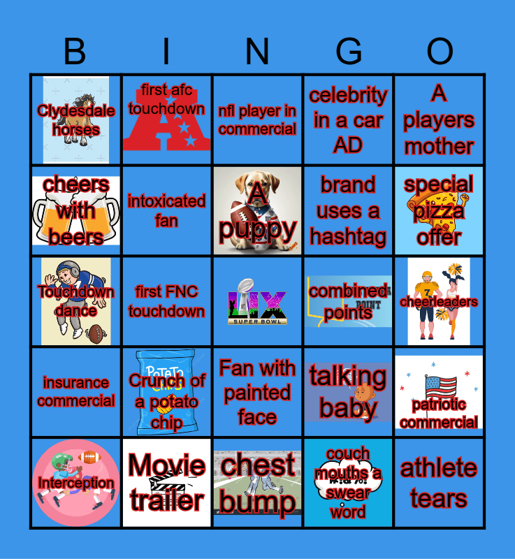 This bingo card has 15 images, a free space and 24 words: Interception, Crunch of a potato chip, A puppy, couch mouths a swear word, A players mother, Clydesdale horses, first afc touchdown, nfl player in commercial, combined points, cheerleaders, Touchdown dance, intoxicated fan, talking baby, patriotic commercial, cheers with beers, Movie trailer, chest bump, celebrity in a car AD, special pizza offer, insurance commercial, first FNC touchdown, Fan with painted face, brand uses a hashtag and athlete tears.