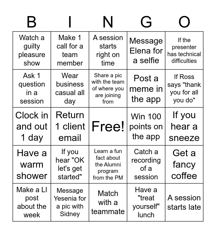 This bingo card has a free space and 24 words: If you hear "OK let's get started", Message Yesenia for a pic with Sidney, Share a pic with the team of where you are joining from, Make a LI post about the week, If the presenter has technical difficulties, Watch a guilty pleasure show, Ask 1 question in a session, Make 1 call for a team member, Win 100 points on the app, Learn a fun fact about the Alumni program from the PM, Post a meme in the app, Clock in and out 1 day, Catch a recording of a session, Get a fancy coffee, Wear business casual all day, Have a "treat yourself" lunch, If you hear a sneeze, A session starts right on time, If Ross says "thank you for all you do", Return 1 client email, A session starts late, Have a warm shower, Message Elena for a selfie and Match with a teammate.