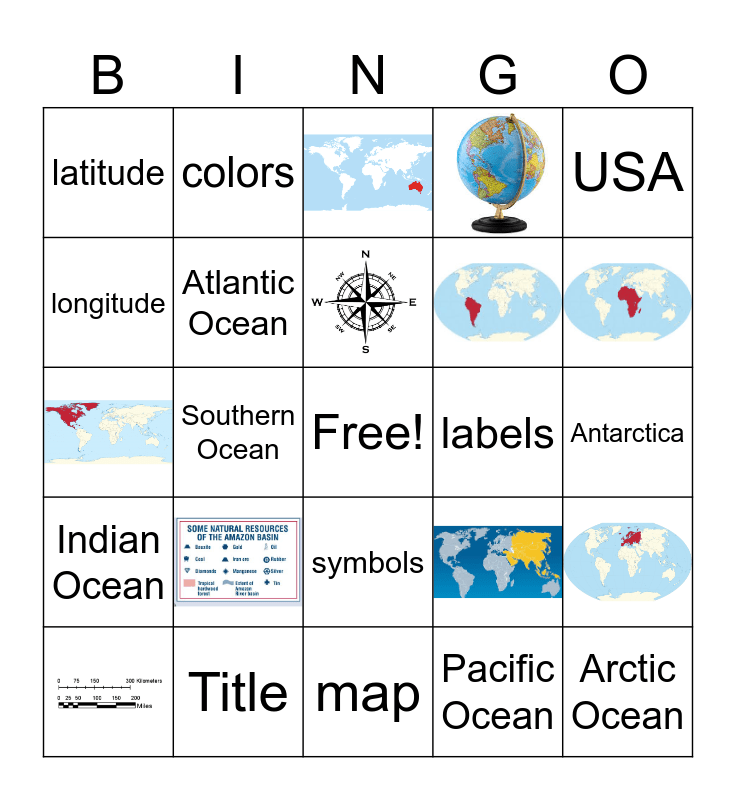 This bingo card has 10 images, a free space and 14 words: Title, USA, latitude, longitude, colors, labels, symbols, Atlantic Ocean, Pacific Ocean, Antarctica, Southern Ocean, Arctic Ocean, Indian Ocean and map.