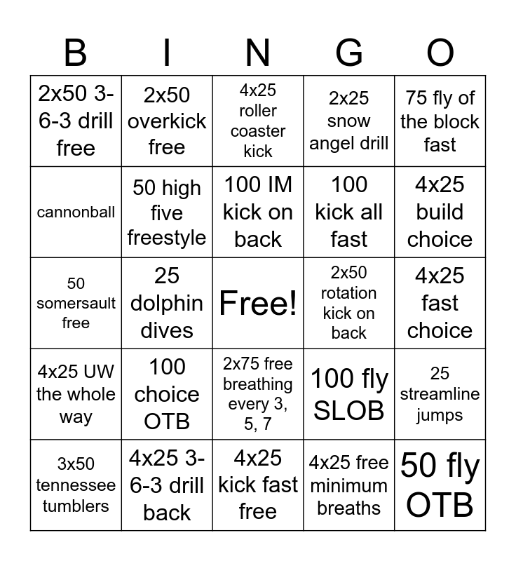 This bingo card has a free space and 34 words: 2x50 breast extended glide drill, 4x25 free minimum breaths, 100 kick build by 25, 3x50 4 tap free drill, 4x25 UW the whole way, 50 high five freestyle, 75 fly of the block fast, 3x50 tennessee tumblers, 2x50 overkick free, 100 IM OTB, 100 IM kick on back, 4x25 roller coaster kick, 4x25 choice drill, 50 free OTB, 2x50 rotation kick on back, 4x25 build choice, 4x25 3-6-3 drill back, 50 somersault free, 100 choice OTB, 100 fly SLOB, 2x75 free breathing every 3, 5, 7, 4x25 backstroke fast, 2x50 3-6-3 drill free, 4x25 fast choice, 4x25 kick fast free, 50 fly OTB, 2x25 snow angel drill, 50 scull, 100 kick all fast, cannonball, 25 worm, 25 dolphin dives, 25 streamline jumps and 50 recovery.