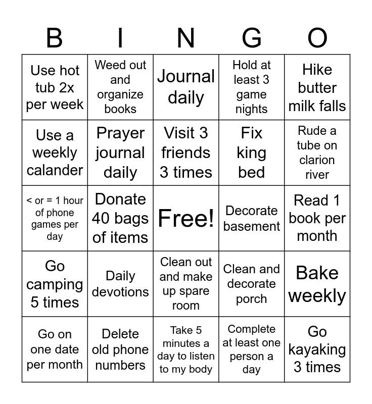 This bingo card has a free space and 24 words: Daily devotions, Delete old phone numbers, Visit 3 friends 3 times, Go on one date per month, Hike butter milk falls, Use hot tub 2x per week, Use a weekly calander, Weed out and organize books, Decorate basement, Clean out and make up spare room, Fix king bed, < or = 1 hour of phone games per day, Clean and decorate porch, Bake weekly, Prayer journal daily, Complete at least one person a day, Read 1 book per month, Journal daily, Rude a tube on clarion river, Donate 40 bags of items, Go kayaking 3 times, Go camping 5 times, Hold at least 3 game nights and Take 5 minutes a day to listen to my body.