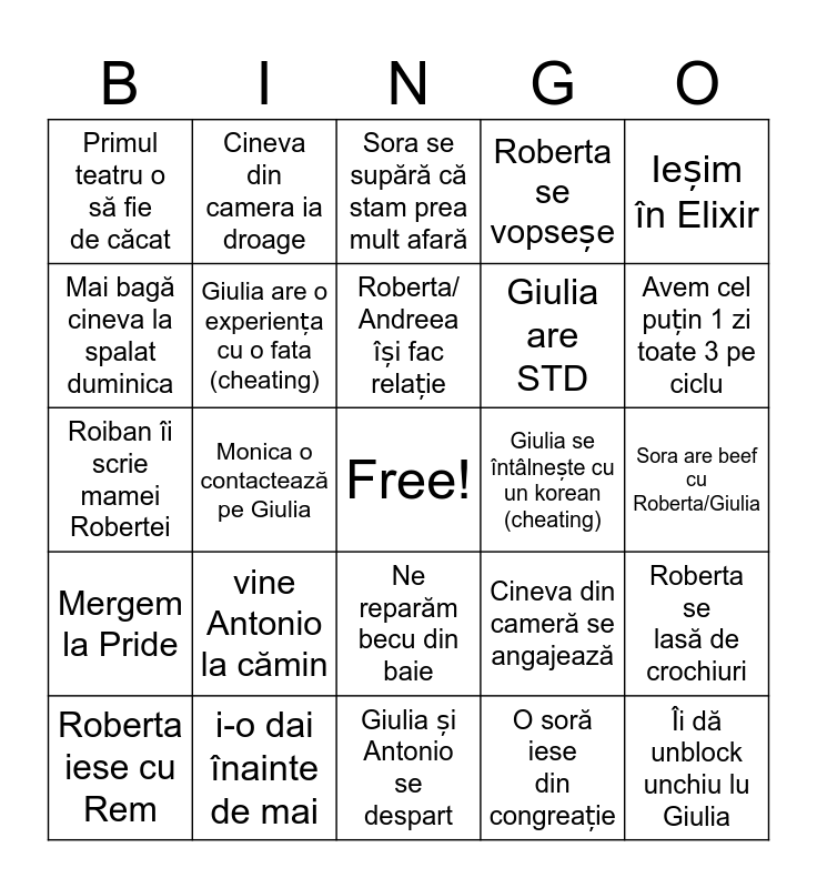 This bingo card has a free space and 24 words: vine Antonio la cămin, i-o dai înainte de mai, Roberta/ Andreea își fac relație, Roberta iese cu Rem, Ieșim în Elixir, Primul teatru o să fie de căcat, Mai bagă cineva la spalat duminica, Cineva din camera ia droage, Giulia se întâlnește cu un korean (cheating), Ne reparăm becu din baie, Giulia are STD, Roiban îi scrie mamei Robertei, Cineva din cameră se angajează, Roberta se lasă de crochiuri, Giulia are o experiența cu o fata (cheating), O soră iese din congreație, Sora are beef cu Roberta/Giulia, Sora se supără că stam prea mult afară, Avem cel puțin 1 zi toate 3 pe ciclu, Monica o contactează pe Giulia, Îi dă unblock unchiu lu Giulia, Mergem la Pride, Roberta se vopseșe and Giulia și Antonio se despart.
