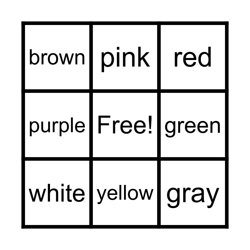 This bingo card has a free space and 11 words: orange, yellow, gray, white, pink, red, green, blue, purple, brown and black.