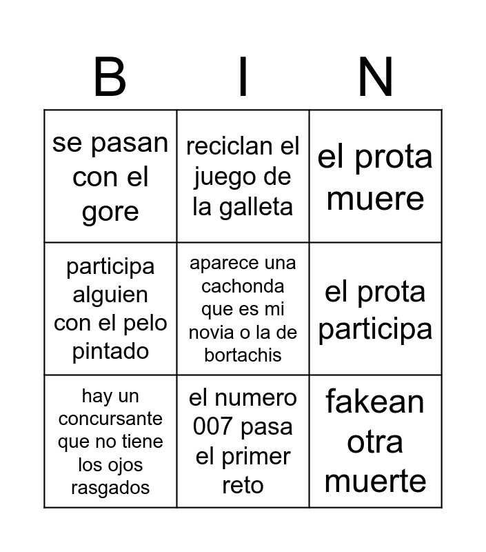 This bingo card has a free space and 8 words: el prota participa, el prota muere, reciclan el juego de la galleta, hay un concursante que no tiene los ojos rasgados, se pasan con el gore, fakean otra muerte, participa alguien con el pelo pintado and el numero 007 pasa el primer reto.