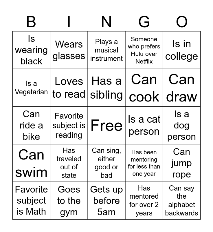 This bingo card has a free space and 24 words: Favorite subject is Math, Has traveled out of state, Has a sibling, Has mentored for over 2 years, Is in college, Is wearing black, Wears glasses, Plays a musical instrument, Is a cat person, Is a dog person, Can ride a bike, Loves to read, Has been mentoring for less than one year, Can jump rope, Is a Vegetarian, Goes to the gym, Gets up before 5am, Someone who prefers Hulu over Netflix, Can draw, Can swim, Favorite subject is reading, Can sing, either good or bad, Can cook and Can say the alphabet backwards.