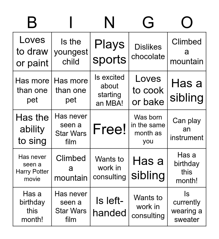 This bingo card has a free space and 55 words: Can play an instrument, Has a birthday this month!, Wears glasses, Loves to draw or paint, Is left-handed, Is an only child, Has more than one pet, Has the ability to sing, Loves to cook or bake, Has never seen a Harry Potter movie, Dislikes chocolate, Is the oldest child, Is the youngest child, Is a middle child, Favorite color is blue, Loves to read, Climbed a mountain, Has never seen a Star Wars film, Likes to get up early, Is currently wearing a sweater, Was born in the same month as you, Can play an instrument, Has a sibling, Plays sports, Knows how to ice skate, Is excited about starting an MBA!, Wants to work in consulting, Has a favorite Key Performance Indicator, Can play an instrument, Has a birthday this month!, Wears glasses, Loves to draw or paint, Is left-handed, Is an only child, Has more than one pet, Has the ability to sing, Loves to cook or bake, Has never seen a Harry Potter movie, Dislikes chocolate, Is the oldest child, Is the youngest child, Is a middle child, Favorite color is blue, Loves to read, Climbed a mountain, Has never seen a Star Wars film, Likes to get up early, Is currently wearing a sweater, Was born in the same month as you, Has a sibling, Plays sports, Knows how to ice skate, Is excited about starting an MBA!, Wants to work in consulting and Has a favorite Key Performance Indicator.
