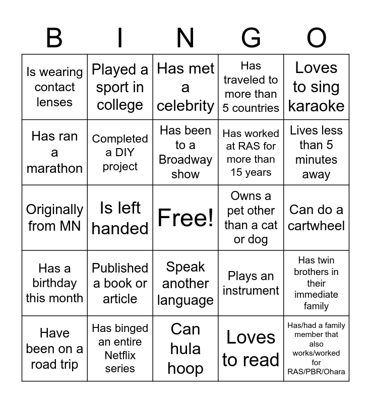 This bingo card has a free space and 24 words: Published a book or article, Has binged an entire Netflix series, Has been to a Broadway show, Have been on a road trip, Loves to sing karaoke, Is wearing contact lenses, Has ran a marathon, Played a sport in college, Owns a pet other than a cat or dog, Speak another language, Has worked at RAS for more than 15 years, Originally from MN, Plays an instrument, Has twin brothers in their immediate family, Completed a DIY project, Loves to read, Can do a cartwheel, Has met a celebrity, Lives less than 5 minutes away, Is left handed, Has/had a family member that also works/worked for RAS/PBR/Ohara, Has a birthday this month, Has traveled to more than 5 countries and Can hula hoop.