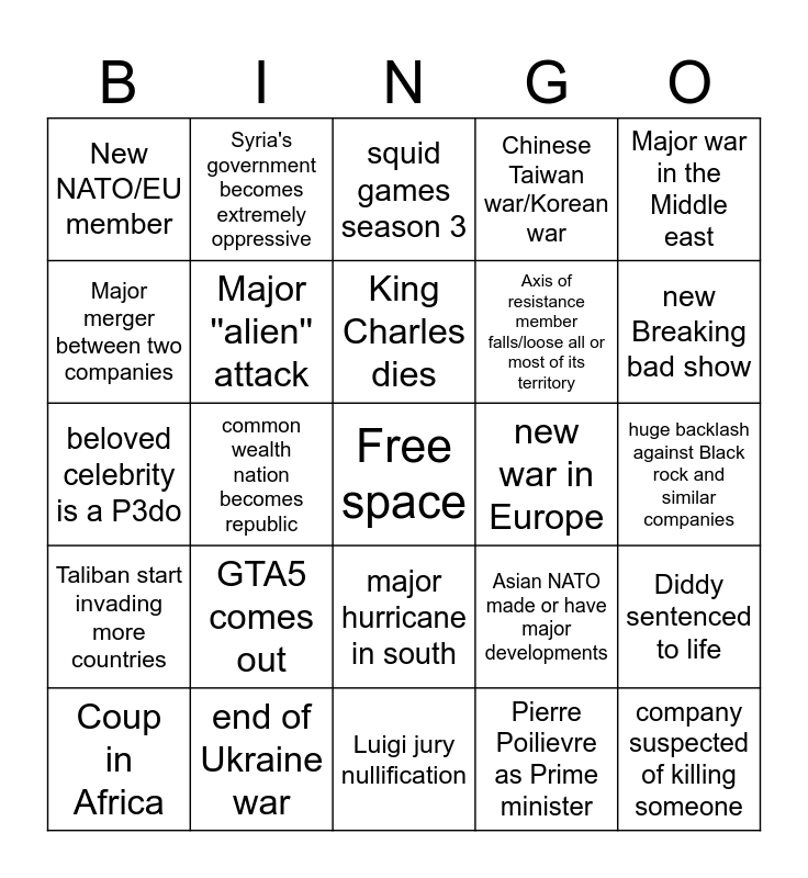 This bingo card has a free space and 24 words: GTA5 comes out, end of Ukraine war, King Charles dies, Coup in Africa, Major war in the Middle east, New NATO/EU member, Major merger between two companies, Syria's government becomes extremely oppressive, new war in Europe, major hurricane in south, Axis of resistance member falls/loose all or most of its territory, beloved celebrity is a P3do, Asian NATO made or have major developments, Diddy sentenced to life, Major ''alien'' attack, Pierre Poilievre as Prime minister, huge backlash against Black rock and similar companies, squid games season 3, new Breaking bad show, common wealth nation becomes republic, company suspected of killing someone, Taliban start invading more countries, Chinese Taiwan war/Korean war and Luigi jury nullification.