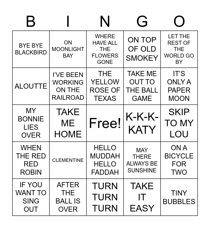 This bingo card has a free space and 66 words: OB LA DI OB LA DA, SHE’LL BE COMING AROUND THE MT, YOU ARE MY SUNSHINE, ON A BICYCLE FOR TWO, LET ME CALL YOU SWEETHEART, BILL BAILEY, ON MOONLIGHT BAY, WHEN JOHNNY COMES MARCHING HOME, THE YELLOW ROSE OF TEXAS, TOO RA LOO RA LOO RA, HELLO MUDDAH HELLO FADDAH, BEER BARREL POLKA, SKIP TO MY LOU, LET THE REST OF THE WORLD GO BY, TENNESSEE WALTZ, ALOUTTE, TAKE ME HOME, BYE BYE BLACKBIRD, BABY FACE, TAKE ME OUT TO THE BALL GAME, CLEMENTINE, WHEN THE RED RED ROBIN, ON TOP OF OLD SMOKEY, TIP TOE THRU THE TULIPS, IT’S THE SAME OLD SHILLELAGH, I LEFT MY HEART IN SAN FRAN, HELLO MY BABY, YOU’RE A GRAND OLD FLAG, TINY BUBBLES, EDELWEISS, IF YOU WANT TO SING OUT, HAPPY DAYS ARE HERE AGAIN, CAMPTOWN RACES, HOME ON THE RANGE, MAY THERE ALWAYS BE SUNSHINE, AFTER THE BALL IS OVER, KUMBAYA, MY BONNIE LIES OVER, TAKE IT EASY, OH SUSANNAH, I’VE BEEN WORKING ON THE RAILROAD, YODELING, K-K-K-KATY, DOWN BY THE RIVERSIDE, MAIRZY DOATS, HUSH LITTLE BABY, IT’S ONLY A PAPER MOON, IT HAD TO BE YOU, POLLY WOLLY DOODLE, FIVE FOOT TWO, YANKEE DOODLE DANDY, PACK UP YOUR TROUBLES, SHOW ME THE WAY TO GO HOME, GOOD NIGHT IRENE, YOU CAN’T ROLLER SKATE, IF YOU COULD READ MY MIND, THIS LAND IS YOUR LAND, AMERICAN PIE, WHERE HAVE ALL THE FLOWERS GONE, TURN TURN TURN, MICHAEL ROW YOUR BOAT ASHORE, BOTH SIDES NOW, DO RE MI, CHUG A LUG, WILL THE CIRCLE BE UNBROKEN and DANNY BOY.