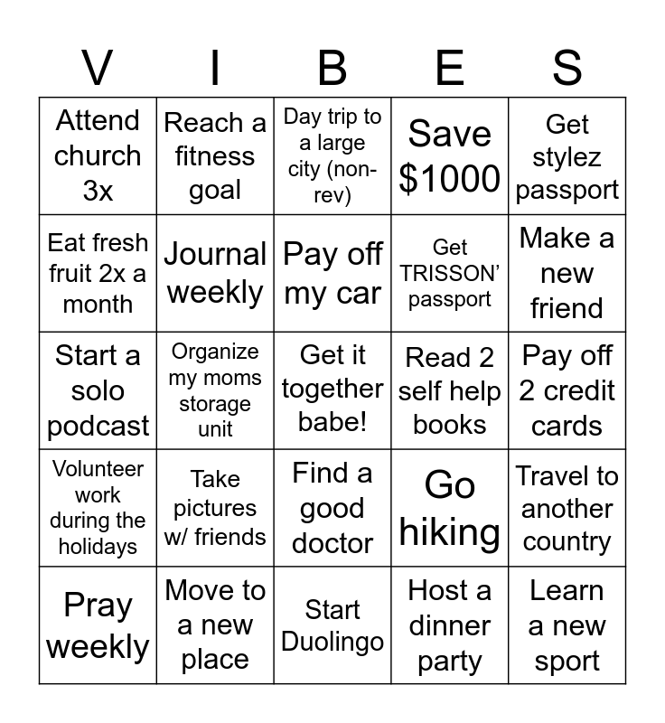 This bingo card has a free space and 24 words: Take pictures w/ friends, Move to a new place, Pay off my car, Pray weekly, Get stylez passport, Attend church 3x, Eat fresh fruit 2x a month, Reach a fitness goal, Read 2 self help books, Find a good doctor, Get TRISSON’ passport, Start a solo podcast, Go hiking, Travel to another country, Journal weekly, Host a dinner party, Pay off 2 credit cards, Day trip to a large city (non-rev), Make a new friend, Organize my moms storage unit, Learn a new sport, Volunteer work during the holidays, Save $1000 and Start Duolingo.