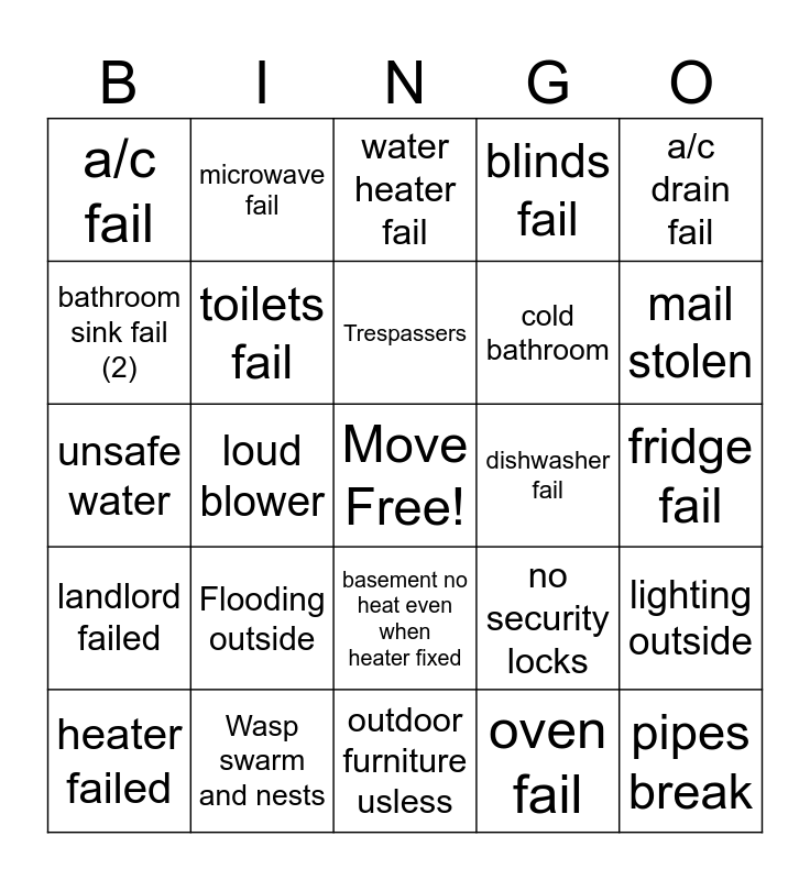 This bingo card has a free space and 24 words: Flooding outside, Wasp swarm and nests, Trespassers, heater failed, a/c drain fail, a/c fail, bathroom sink fail (2), microwave fail, dishwasher fail, basement no heat even when heater fixed, cold bathroom, unsafe water, no security locks, lighting outside, toilets fail, oven fail, fridge fail, water heater fail, mail stolen, loud blower, pipes break, landlord failed, blinds fail and outdoor furniture usless.