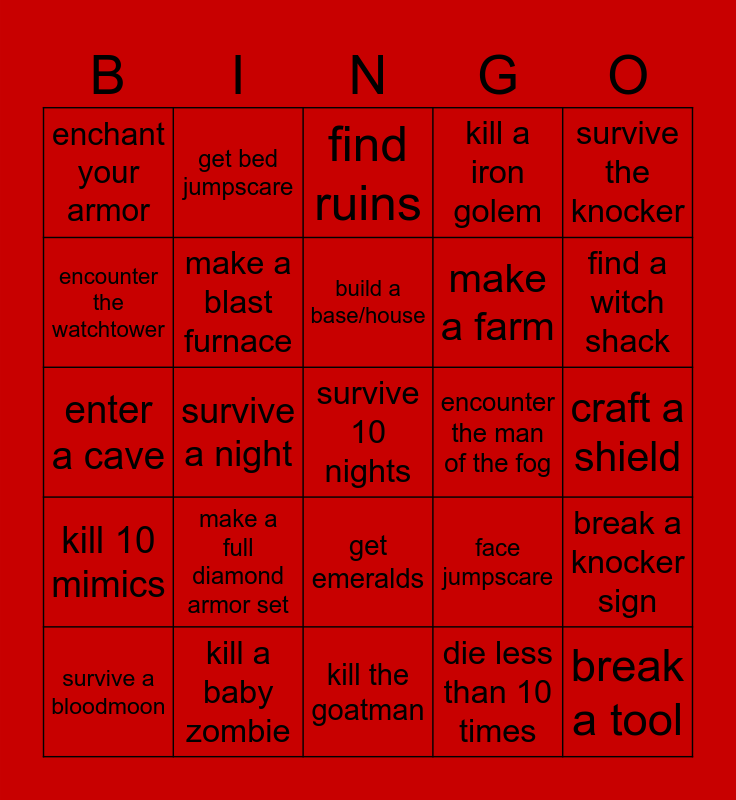 This bingo card has 25 words: make a full diamond armor set, kill the goatman, build a base/house, survive a bloodmoon, survive the knocker, enchant your armor, encounter the watchtower, get bed jumpscare, encounter the man of the fog, get emeralds, make a farm, enter a cave, face jumpscare, break a knocker sign, make a blast furnace, break a tool, craft a shield, find ruins, find a witch shack, survive a night, survive 10 nights, kill a baby zombie, kill 10 mimics, kill a iron golem and die less than 10 times.