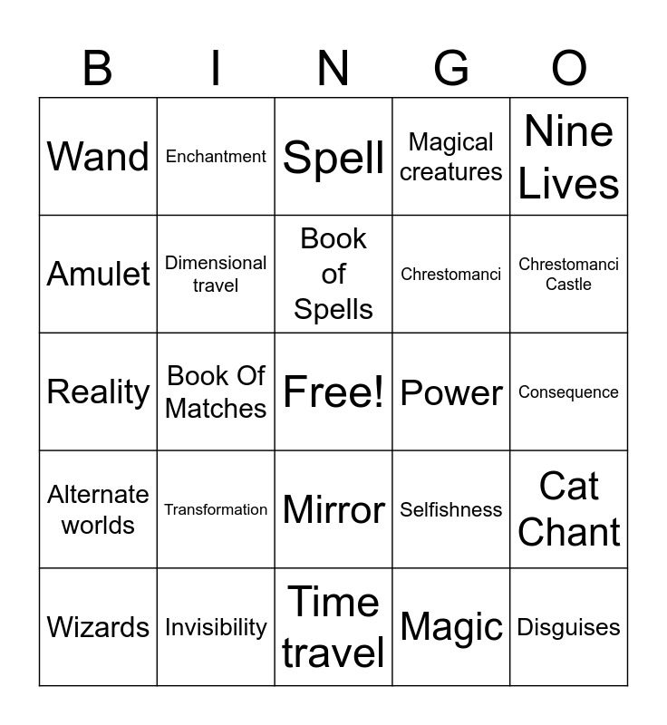 This bingo card has a free space and 28 words: Cat Chant, Gwendolen Chant, Chrestomanci, Magic, Amulet, Spell, Enchantment, Alternate worlds, Power, Wizards, Reality, Magical creatures, Invisibility, Time travel, Chrestomanci Castle, Council of Magicians, Transformation, Dimensional travel, Book of Spells, Mirror, Wand, Pet, Disguises, Book Of Matches, Consequence, Selfishness, Nine Lives and Dragon's Blood.