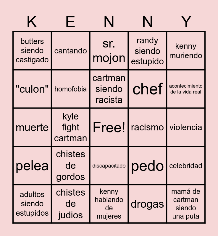 This bingo card has a free space and 24 words: chistes de gordos, chistes de judios, cartman siendo racista, adultos siendo estupidos, kenny muriendo, butters siendo castigado, "culon", cantando, racismo, discapacitado, chef, muerte, pedo, celebridad, homofobia, drogas, violencia, sr. mojon, acontecimiento de la vida real, kyle fight cartman, mamá de cartman siendo una puta, pelea, randy siendo estupido and kenny hablando de mujeres.