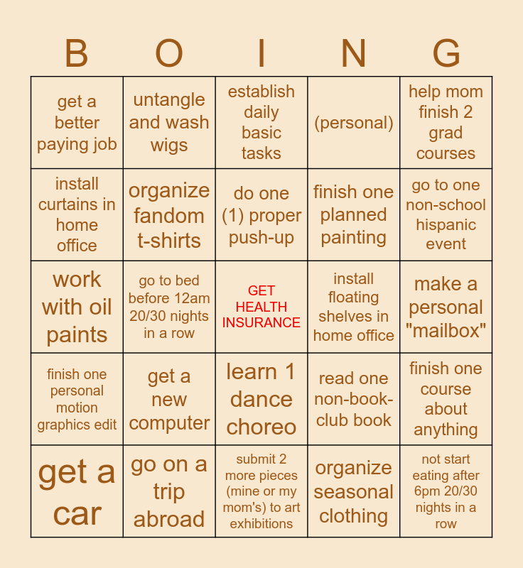 This bingo card has a free space and 24 words: get a new computer, go on a trip abroad, do one (1) proper push-up, get a car, help mom finish 2 grad courses, get a better paying job, install curtains in home office, untangle and wash wigs, install floating shelves in home office, learn 1 dance choreo, finish one planned painting, work with oil paints, read one non-book-club book, finish one course about anything, organize fandom t-shirts, organize seasonal clothing, make a personal "mailbox", establish daily basic tasks, go to one non-school hispanic event, go to bed before 12am 20/30 nights in a row, not start eating after 6pm 20/30 nights in a row, finish one personal motion graphics edit, (personal) and submit 2 more pieces (mine or my mom's) to art exhibitions.