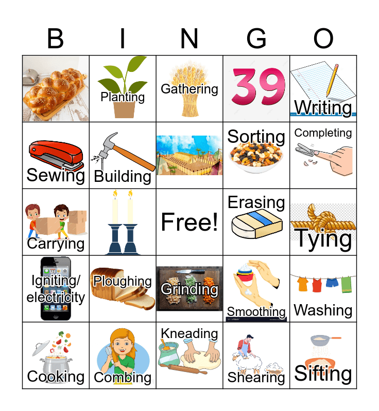 This bingo card has 24 images, a free space and 20 words: Ploughing, Combing, Cooking, Writing, Sewing, Planting, Erasing, Grinding, Sorting, Carrying, Smoothing, Washing, Building, Shearing, Tying, Gathering, Completing, Sifting, Igniting/ electricity and Kneading.