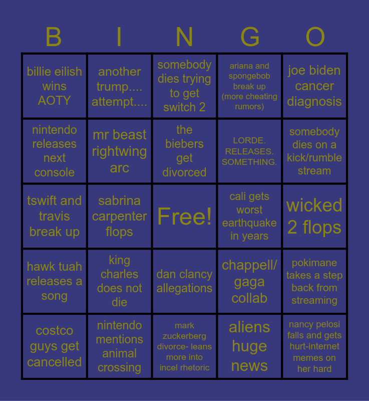 This bingo card has a free space and 24 words: king charles does not die, nintendo mentions animal crossing, the biebers get divorced, costco guys get cancelled, joe biden cancer diagnosis, billie eilish wins AOTY, nintendo releases next console, another trump.... attempt...., cali gets worst earthquake in years, dan clancy allegations, LORDE. RELEASES. SOMETHING., tswift and travis break up, chappell/ gaga collab, pokimane takes a step back from streaming, mr beast rightwing arc, aliens huge news, wicked 2 flops, somebody dies trying to get switch 2, somebody dies on a kick/rumble stream, sabrina carpenter flops, nancy pelosi falls and gets hurt-internet memes on her hard, hawk tuah releases a song, ariana and spongebob break up (more cheating rumors) and mark zuckerberg divorce- leans more into incel rhetoric.