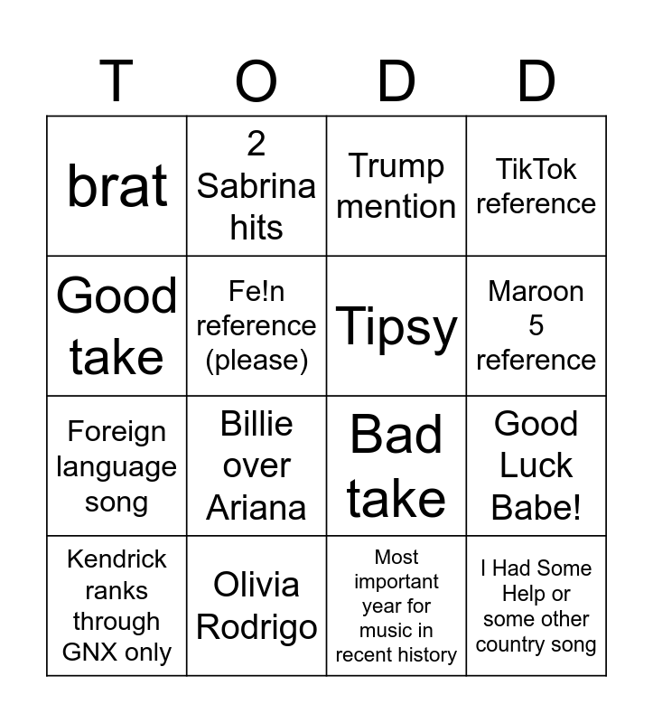 This bingo card has 16 words: Olivia Rodrigo, Good Luck Babe!, Trump mention, brat, Foreign language song, 2 Sabrina hits, Bad take, Most important year for music in recent history, Good take, Fe!n reference (please), Kendrick ranks through GNX only, TikTok reference, Billie over Ariana, Maroon 5 reference, Tipsy and I Had Some Help or some other country song.