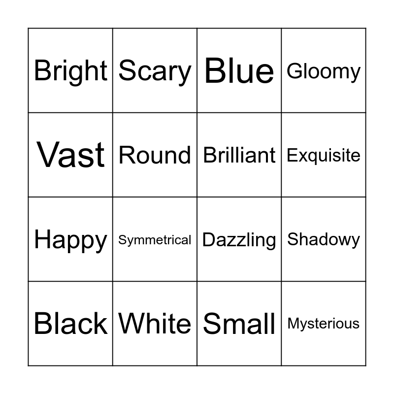 This bingo card has 16 words: White, Shadowy, Blue, Bright, Happy, Scary, Dazzling, Small, Vast, Round, Black, Gloomy, Symmetrical, Exquisite, Brilliant and Mysterious.