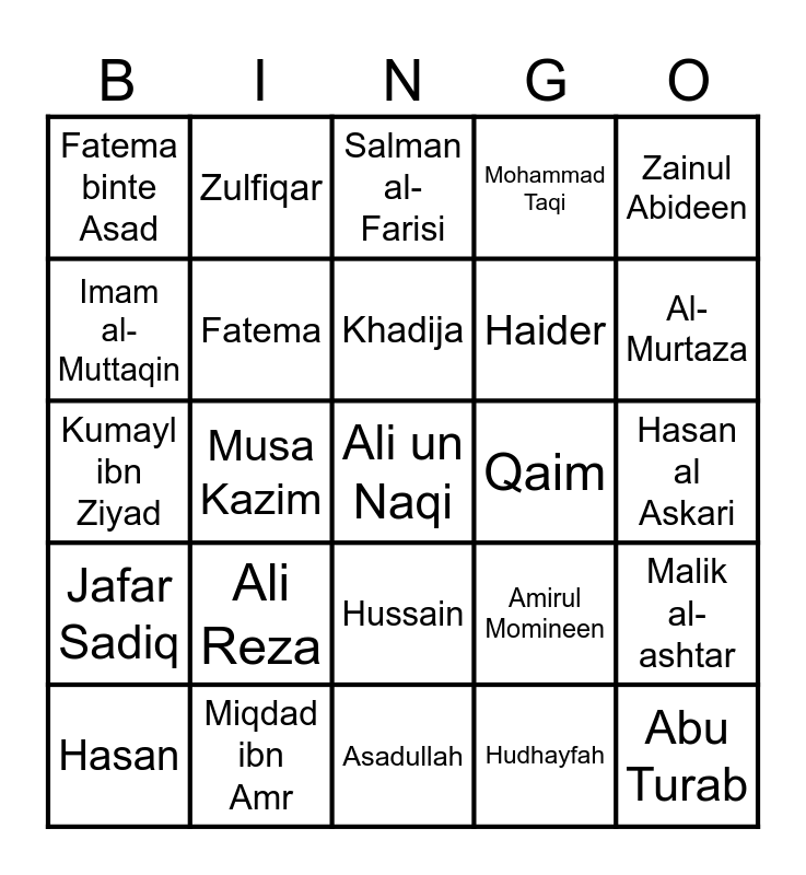 This bingo card has 39 words: Free!, Mohammad, Ali, Fatema, Hasan, Hussain, Khadija, Mohammad Baqir, Zainul Abideen, Jafar Sadiq, Musa Kazim, Mohammad Taqi, Ali un Naqi, Hasan al Askari, Qaim, Ali Reza, Abu Talib, Fatema binte Asad, Abul Hasan, Amirul Momineen, Imam al-Muttaqin, Asadullah, Haider, Al-Murtaza, Al-Wasi, Al-Hadi, Abu Turab, Abul Hussain, Bab e ilm, Zulfiqar, Abu Dharr, Ammar ibn Yasir, Salman al-Farisi, Miqdad ibn Amr, Hudhayfah, Jabir ibn Abdullah, Malik al-ashtar, Kumayl ibn Ziyad and Nahjul Balagha.