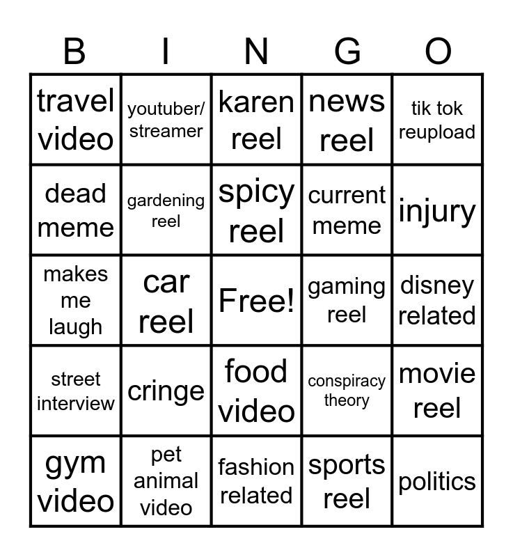 This bingo card has a free space and 24 words: cringe, pet animal video, spicy reel, gym video, tik tok reupload, travel video, dead meme, youtuber/ streamer, gaming reel, food video, current meme, makes me laugh, conspiracy theory, movie reel, gardening reel, sports reel, disney related, karen reel, injury, car reel, politics, street interview, news reel and fashion related.