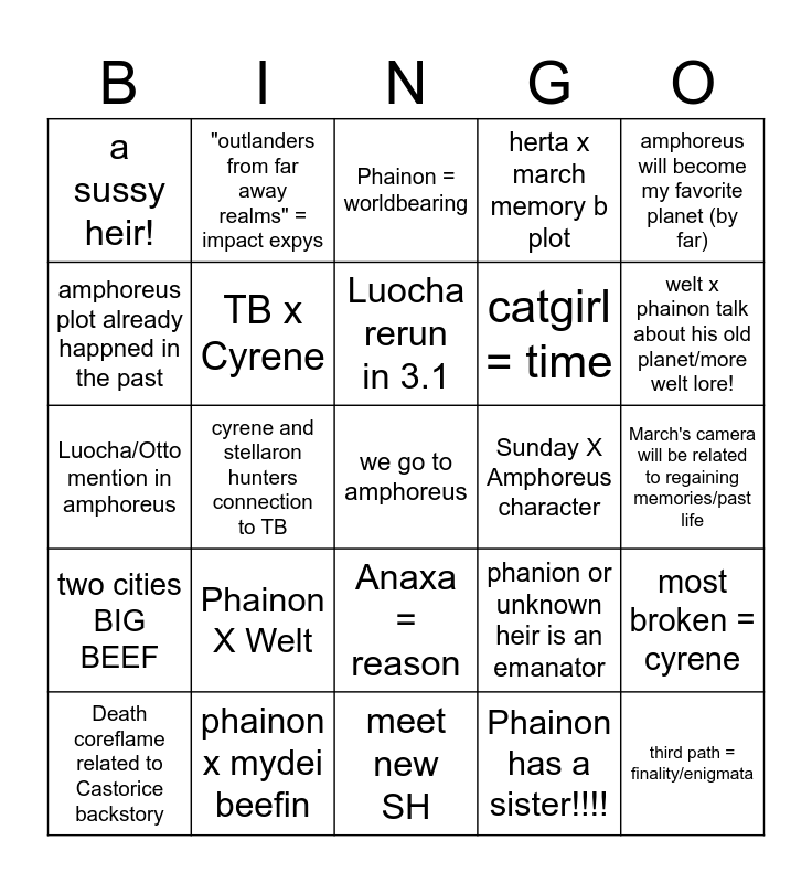 This bingo card has a free space and 24 words: Phainon X Welt, phainon x mydei beefin, Luocha rerun in 3.1, Death coreflame related to Castorice backstory, amphoreus will become my favorite planet (by far), a sussy heir!, amphoreus plot already happned in the past, "outlanders from far away realms" = impact expys, Sunday X Amphoreus character, Anaxa = reason, catgirl = time, Luocha/Otto mention in amphoreus, phanion or unknown heir is an emanator, most broken = cyrene, TB x Cyrene, Phainon has a sister!!!!, March's camera will be related to regaining memories/past life, Phainon = worldbearing, welt x phainon talk about his old planet/more welt lore!, cyrene and stellaron hunters connection to TB, third path = finality/enigmata, two cities BIG BEEF, herta x march memory b plot and meet new SH.