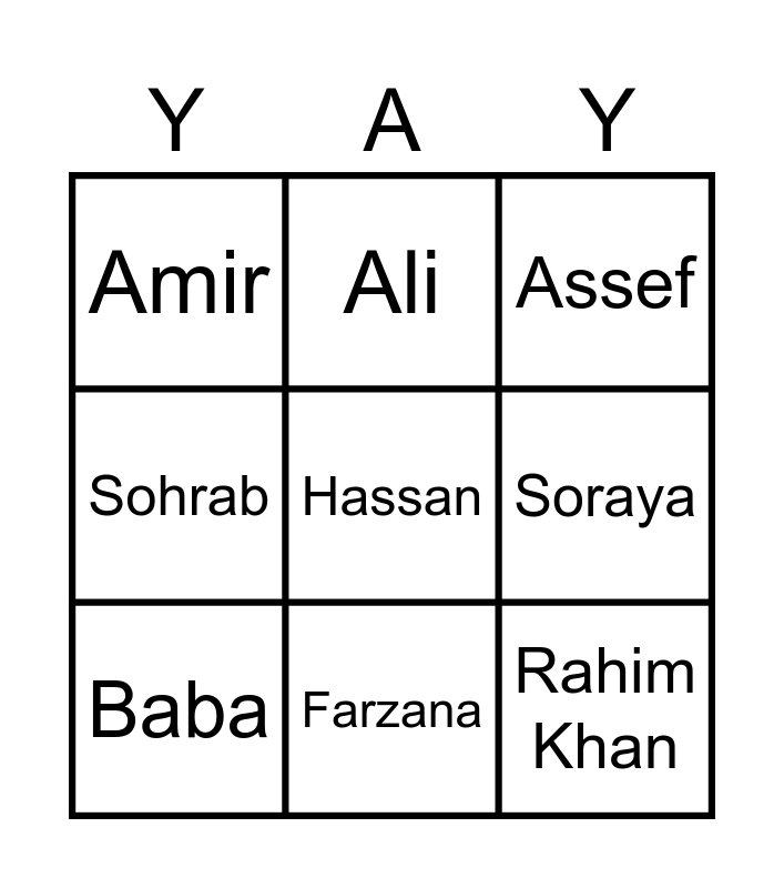 This bingo card has 9 words: Baba, Assef, Ali, Sohrab, Amir, Soraya, Hassan, Rahim Khan and Farzana.