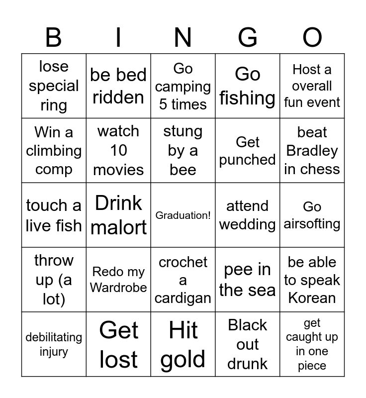 This bingo card has a free space and 24 words: Redo my Wardrobe, Get lost, stung by a bee, debilitating injury, Host a overall fun event, lose special ring, Win a climbing comp, be bed ridden, attend wedding, crochet a cardigan, Get punched, touch a live fish, pee in the sea, be able to speak Korean, watch 10 movies, Black out drunk, Go airsofting, Go camping 5 times, beat Bradley in chess, Drink malort, get caught up in one piece, throw up (a lot), Go fishing and Hit gold.